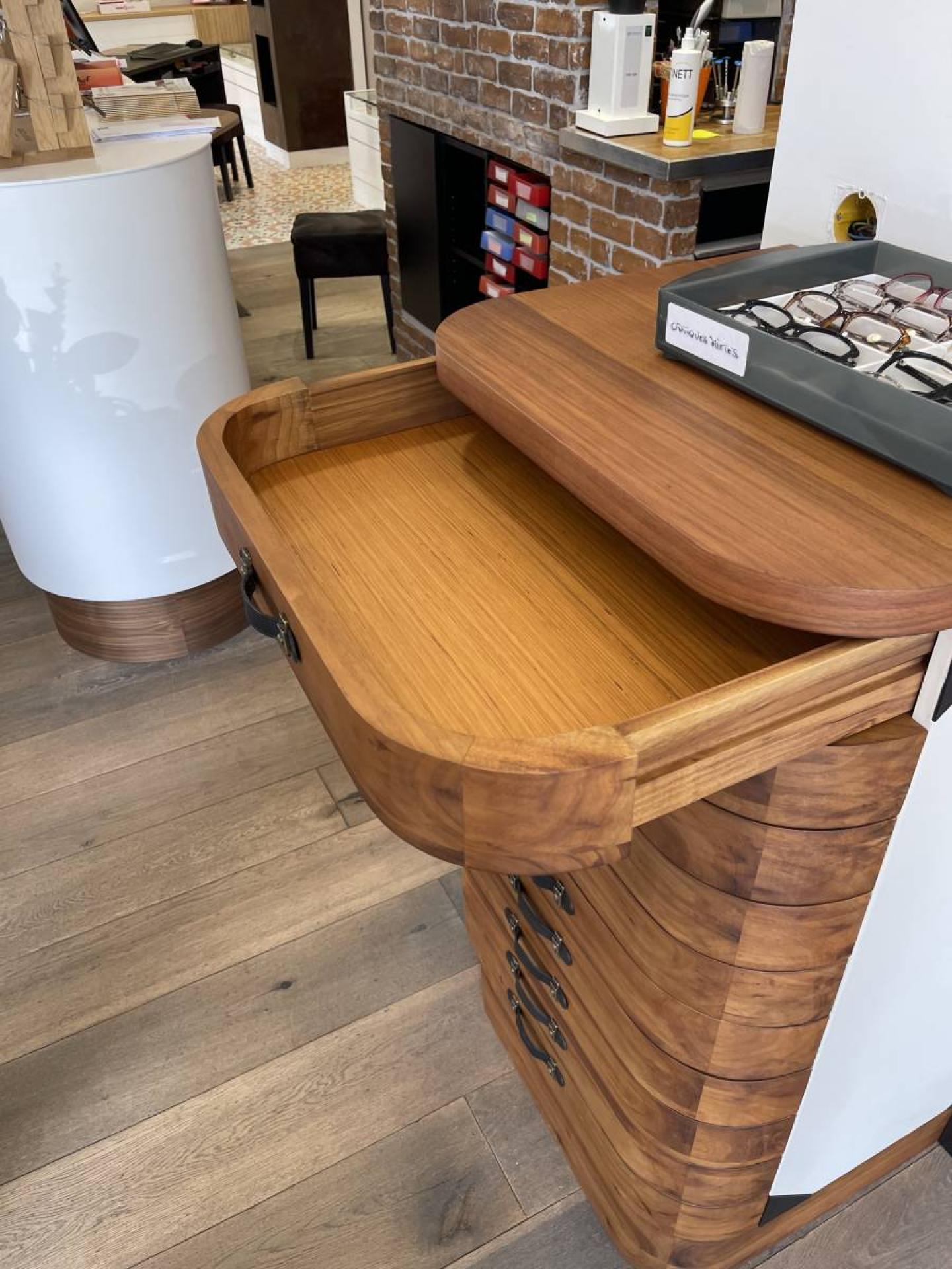 La société LACOSTE AGENCEMENT, menuiserie située à Marcheprime (33), entre Bordeaux et le Bassin d’Arcachon, a récemment réalisé la fabrication et la pose complète d’un agencement sur mesure pour un magasin d’optique à Cestas, près de Bordeaux.