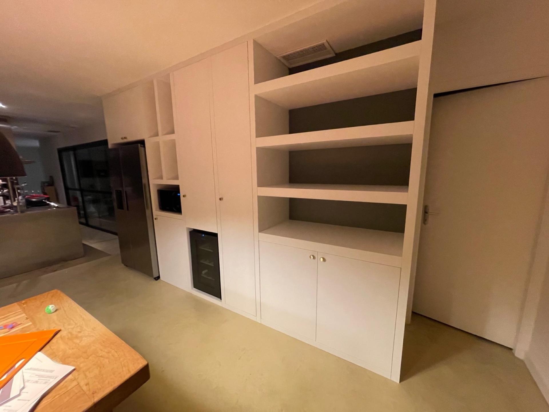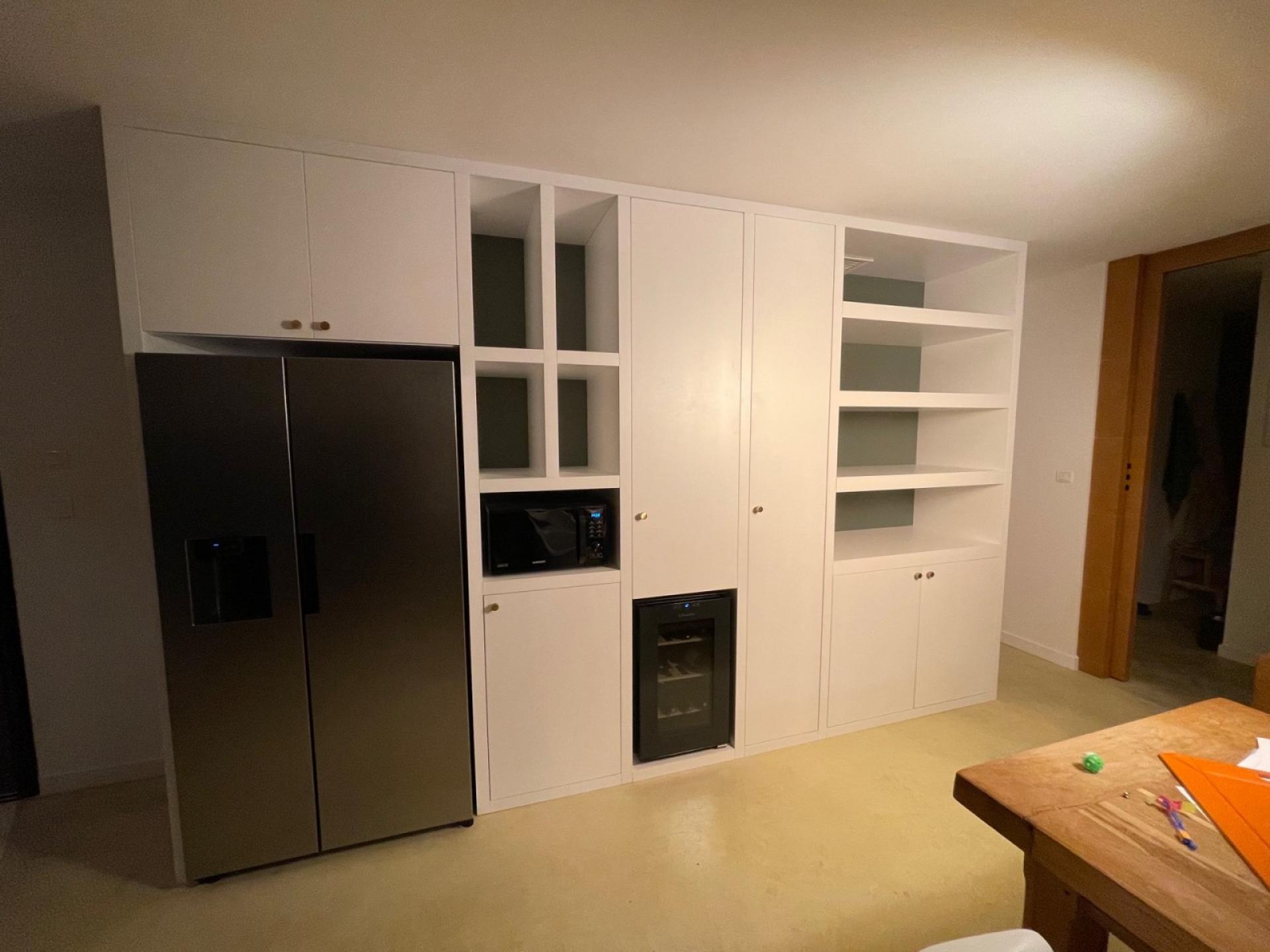 La société Lacoste Agencement a fabriqué un meuble sur-mesure pour intégrer un réfrigérateur américain, une cave à vin et un micro-ondes.