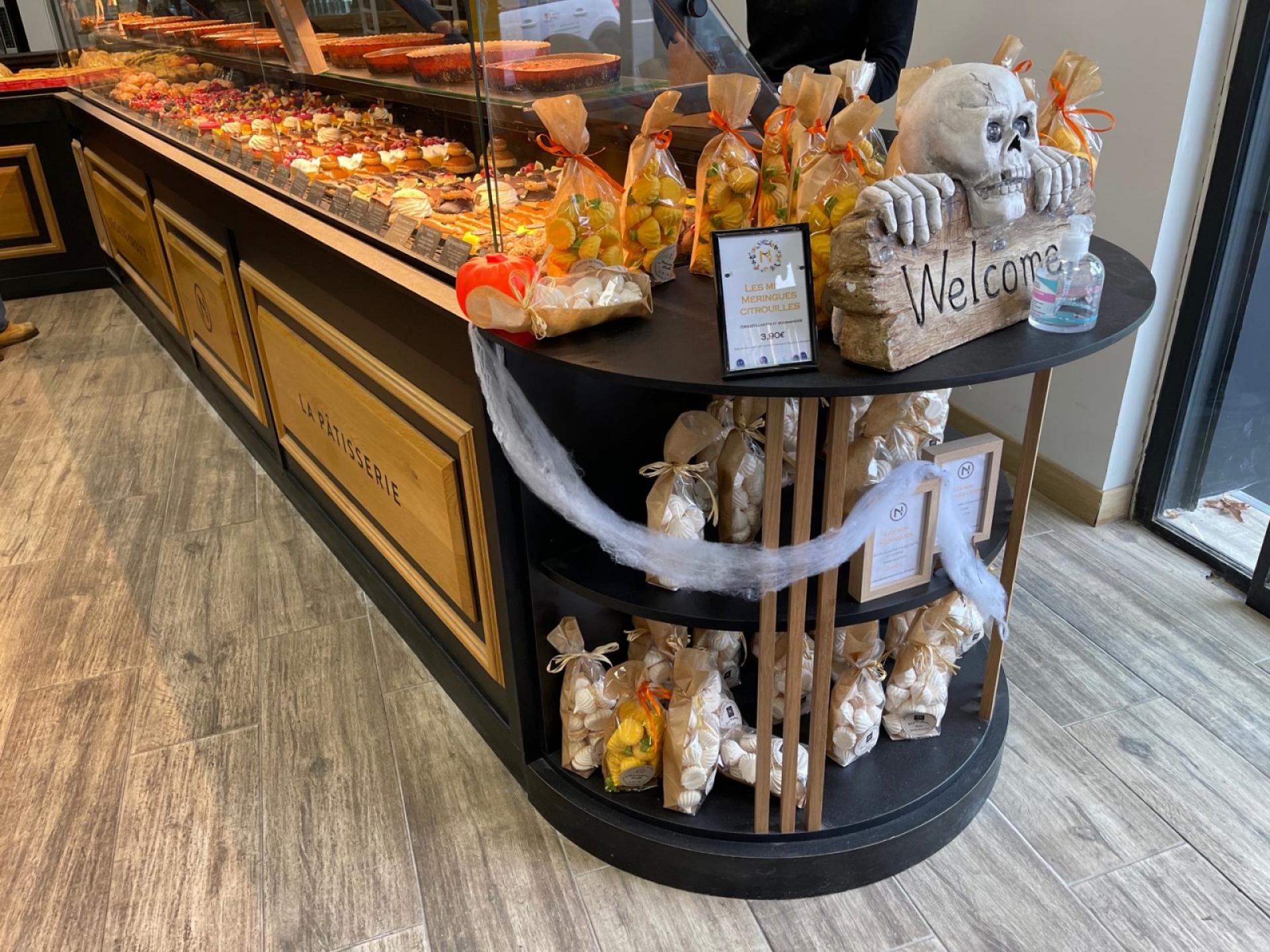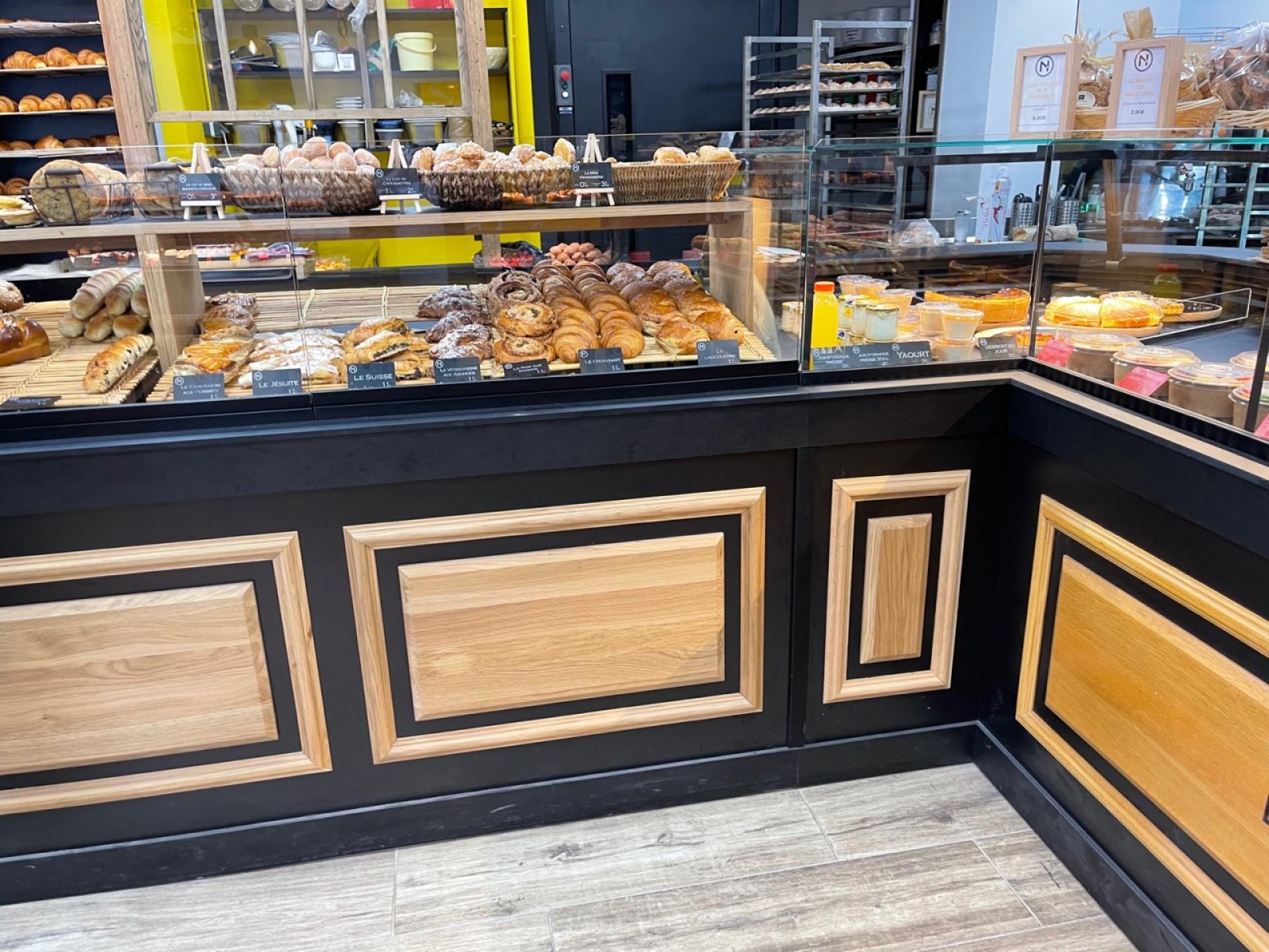 Les habillages des vitrines ainsi que les meubles caisses ont les façades en chêne massif, ce qui amène un côté très chaleureux à cette boulangerie sur Bordeaux.