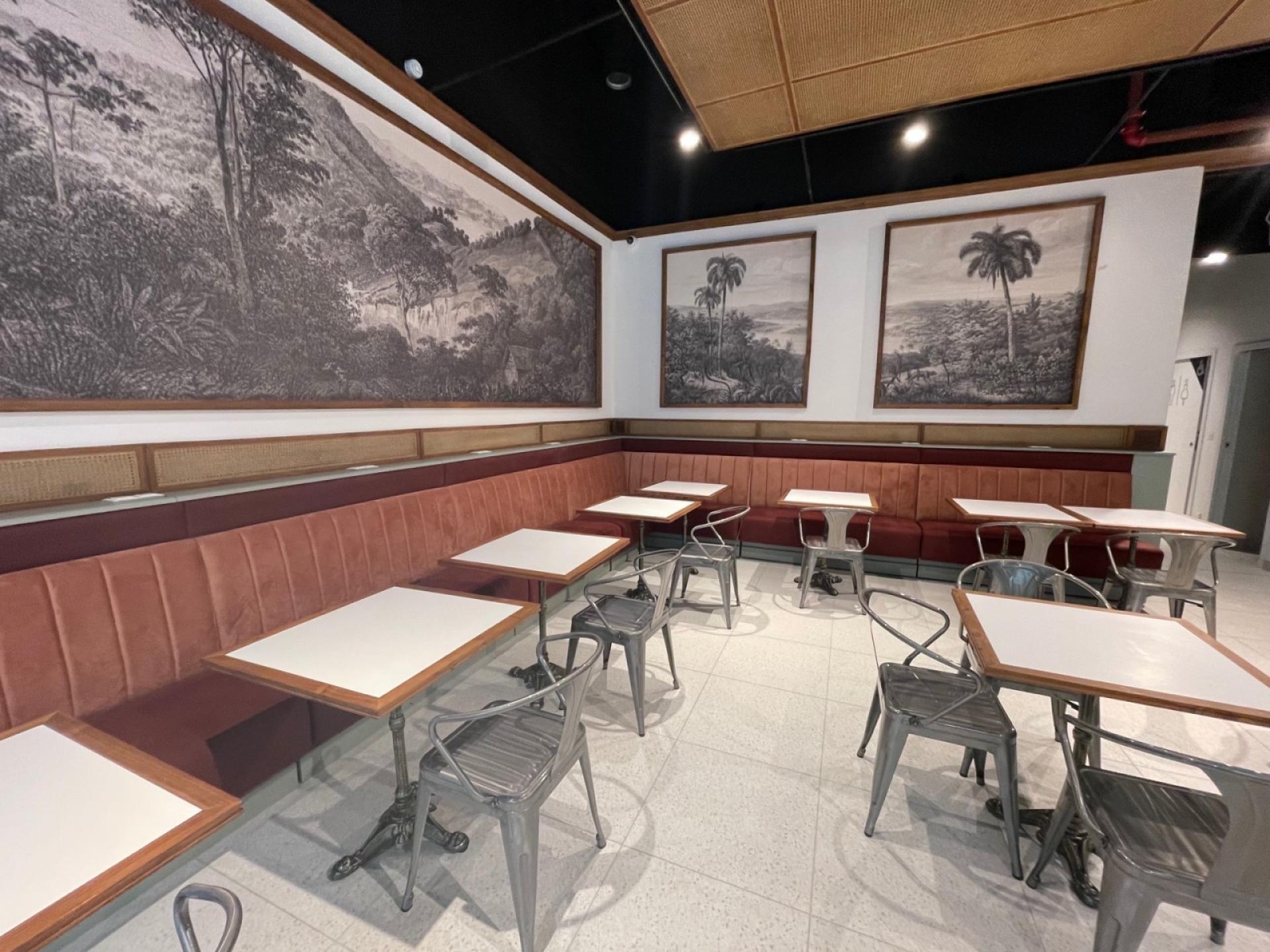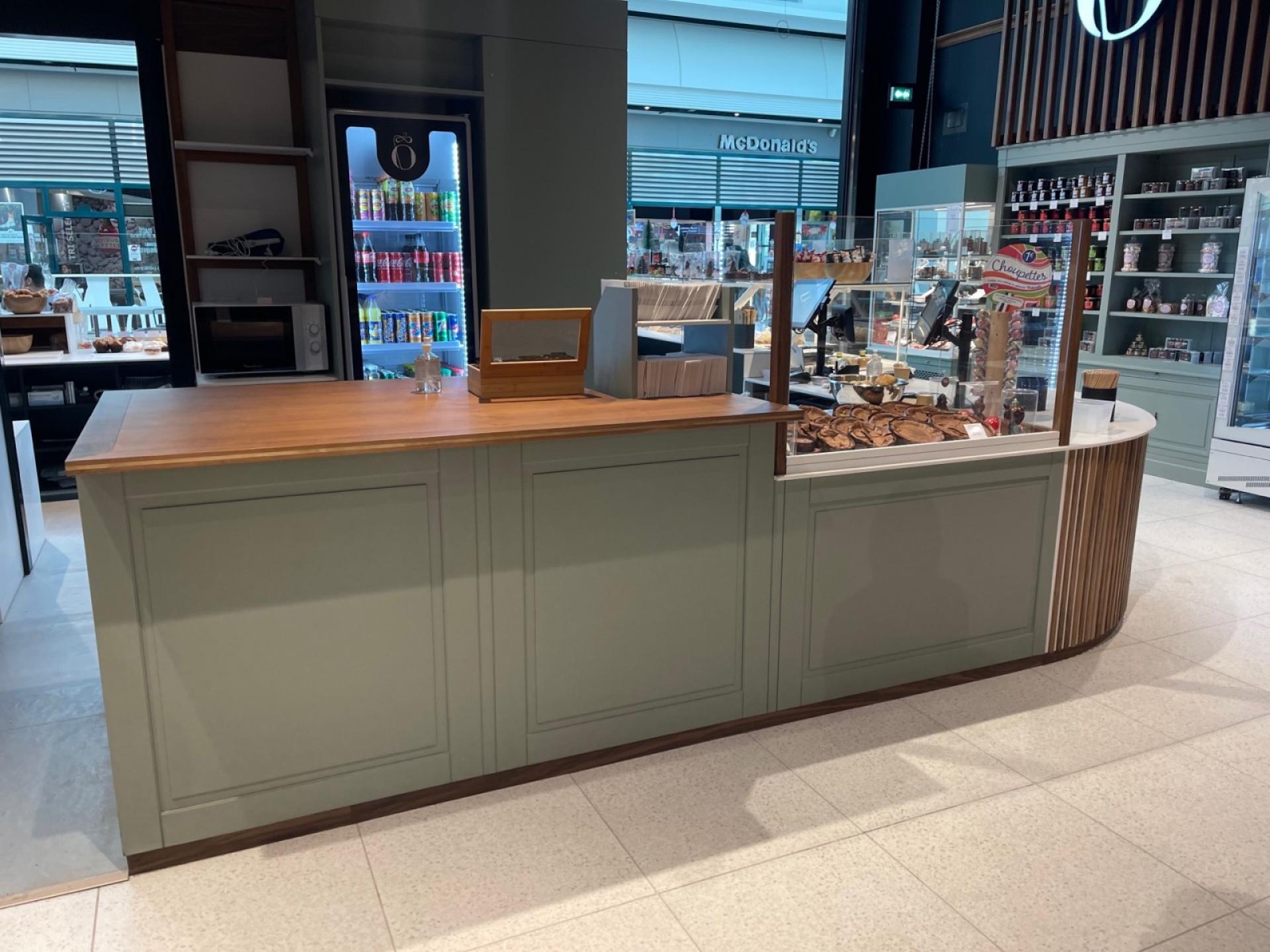 la société Lacoste Agencement.Tout l’agencement de cette boulangerie à Arcachon a été réalisé en Corian, en noyer de France et en cannage.