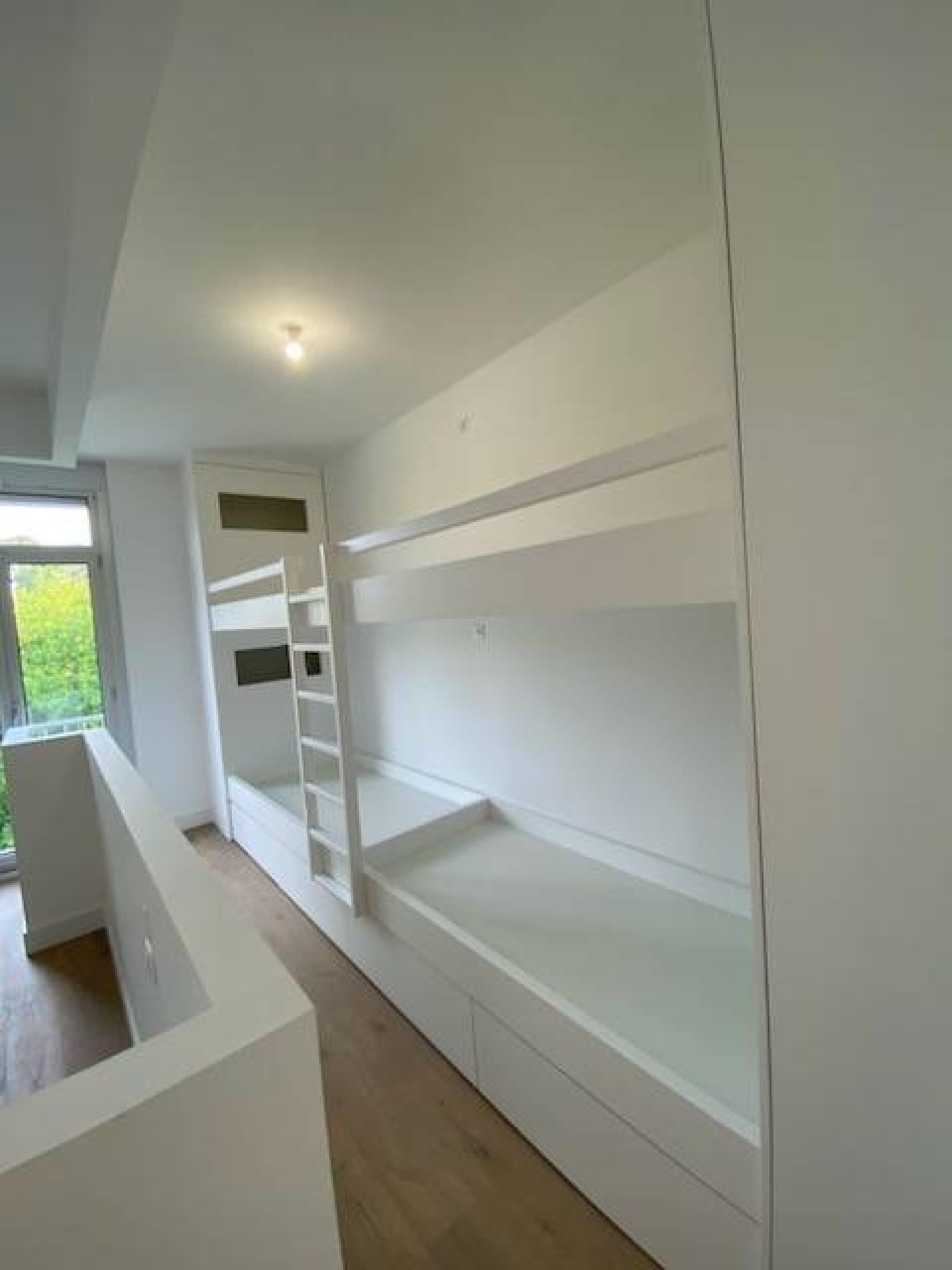 Cet ensemble de couchages se compose de 2 lits en partie basse et deux lits en partie haute ainsi que des niches de rangements et tiroirs.
