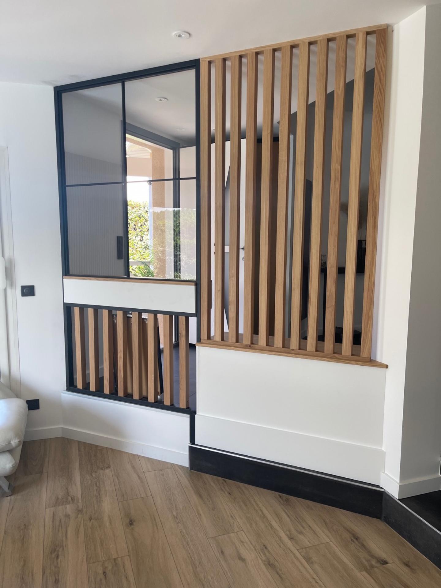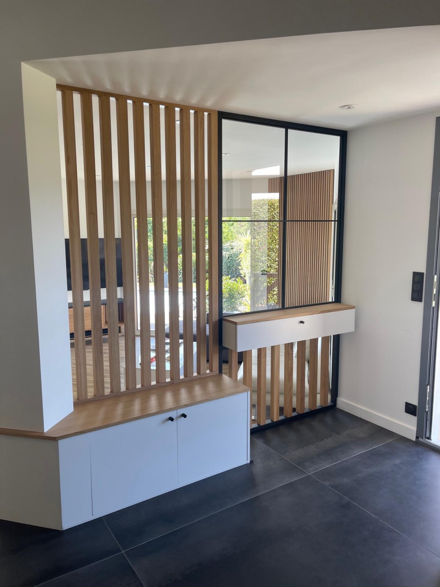Cette séparation de pièces est composée d’un meuble d’entrée avec des claustras ainsi qu’une partie vitrée en fer forgé.