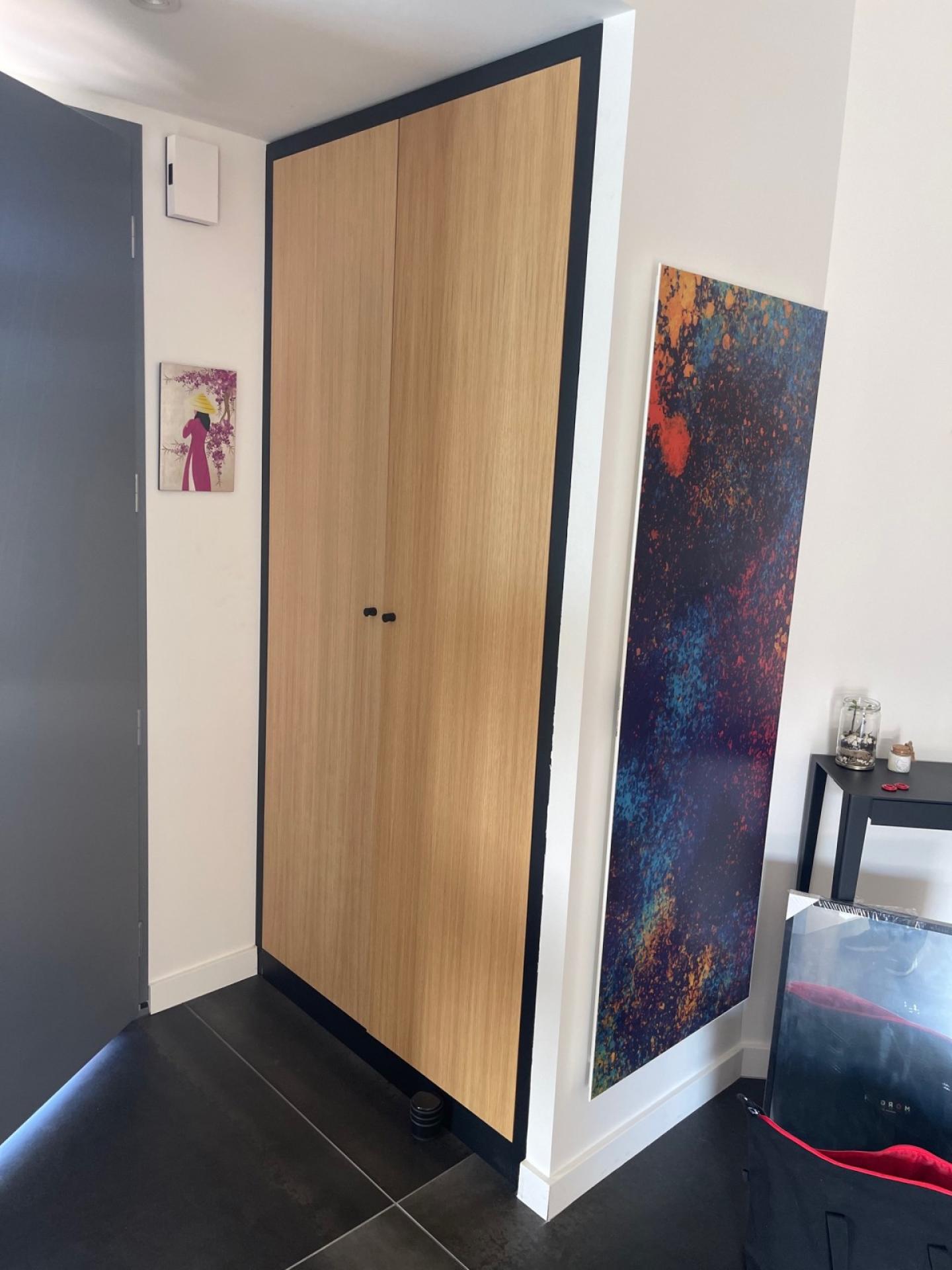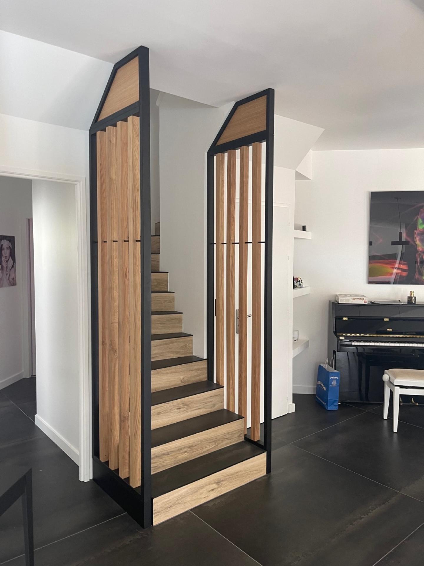 Un placard d’entrée en chêne ainsi que deux claustras pour une remontée d’escalier font de cette ensemble un endroit unique dessiné sur-mesure.