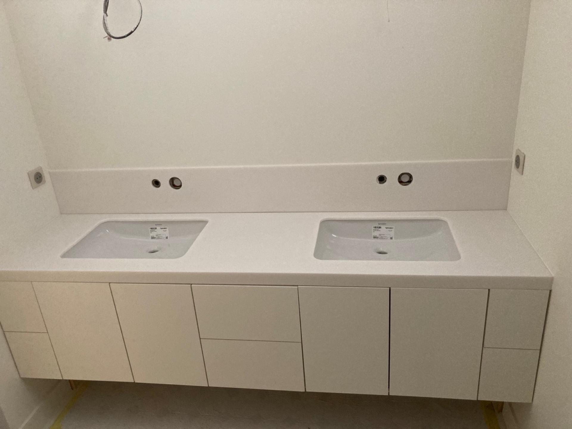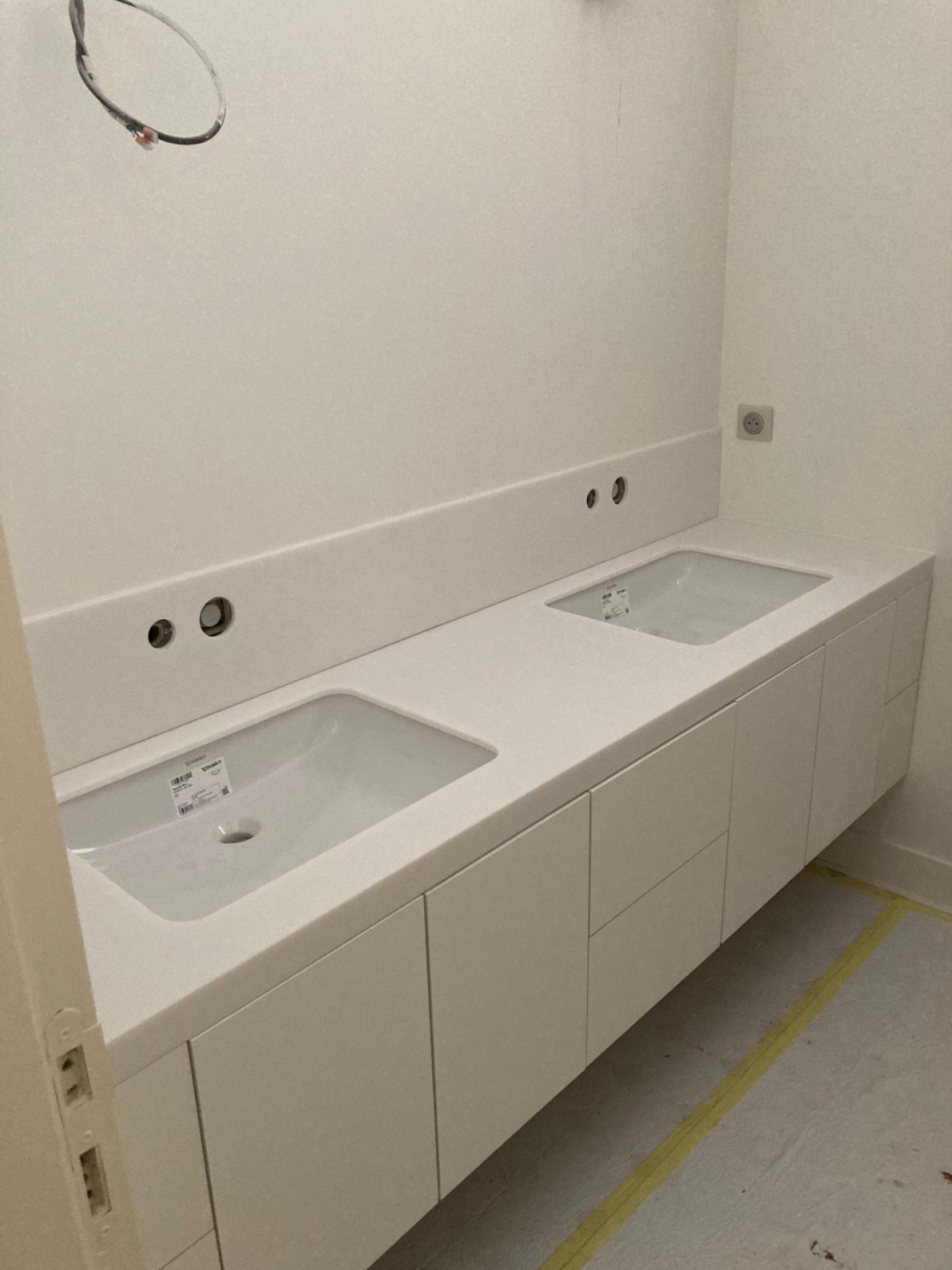 Le point fort de ces réalisations : un plan vasque en Corian (Solid surface), matériau hautement esthétique et résistant, parfaitement intégré avec des vasques en porcelaine. Le rendu est à la fois élégant, sobre et moderne.