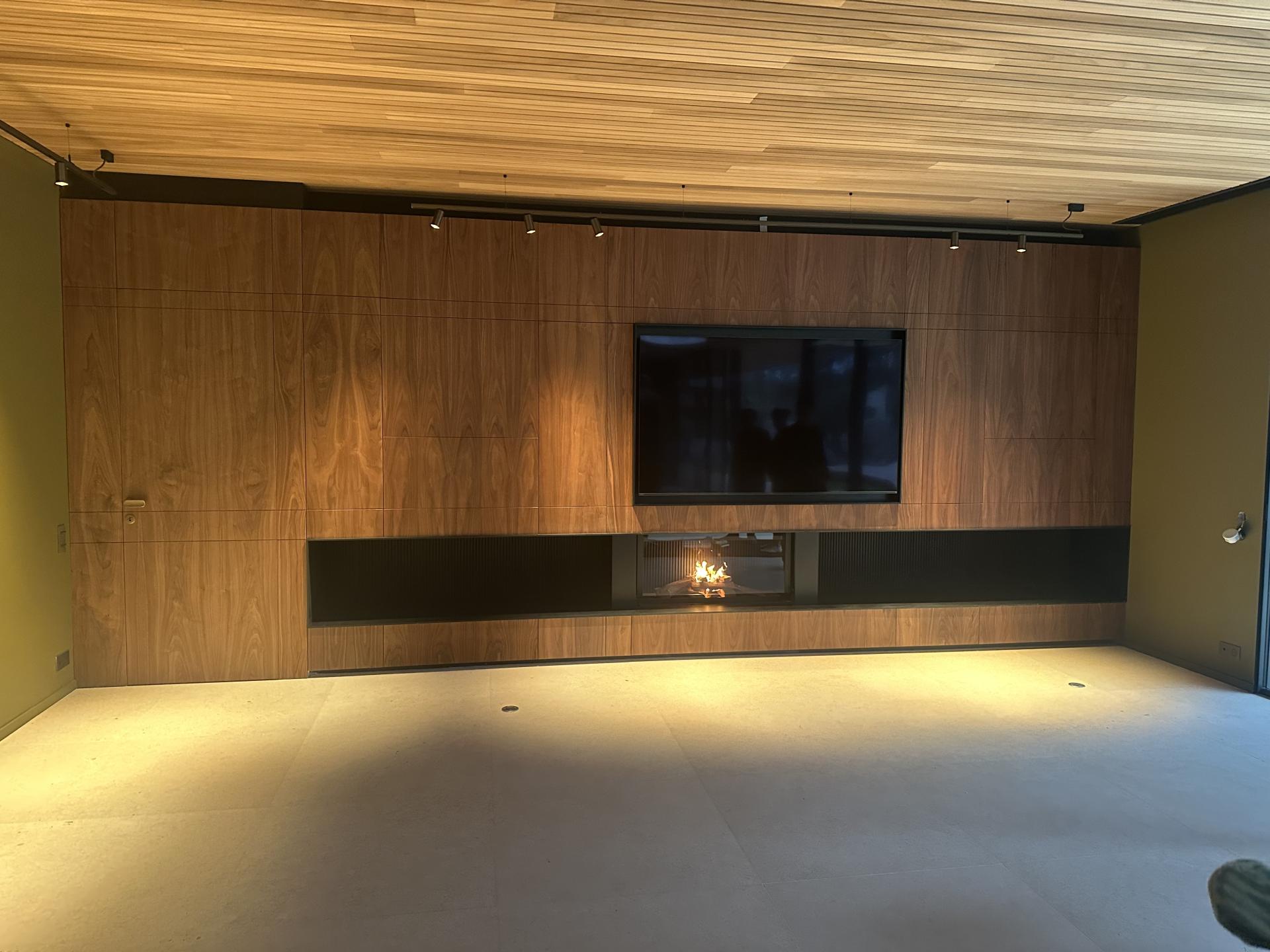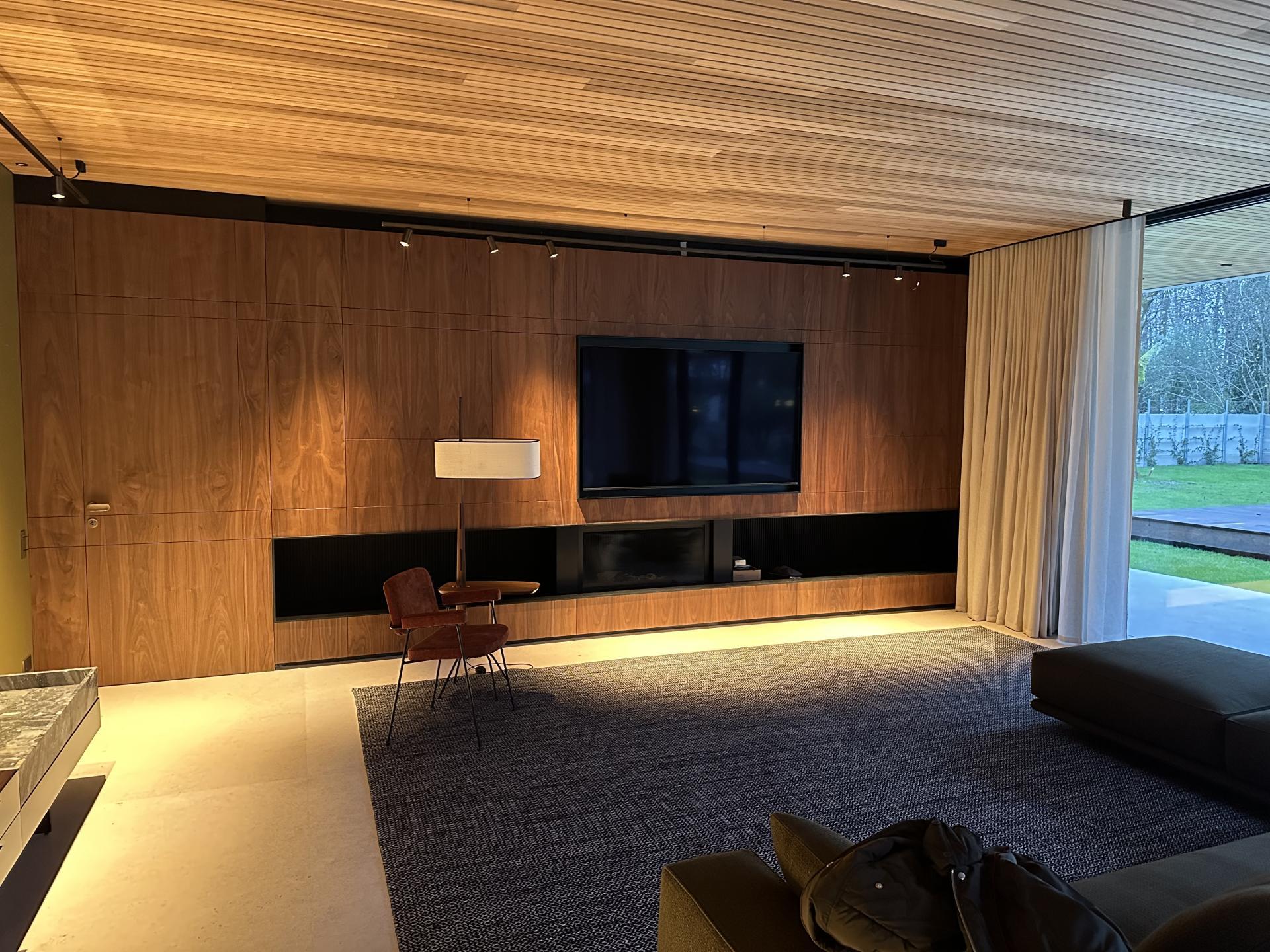 Le meuble sur mesure intègre un grand espace TV, une cheminée moderne et des rangements fonctionnels. Le choix du noyer souligne l’élégance de la réalisation, tandis qu’un bandeau LED met en valeur les lignes du mobilier et crée une atmosphère raffinée.