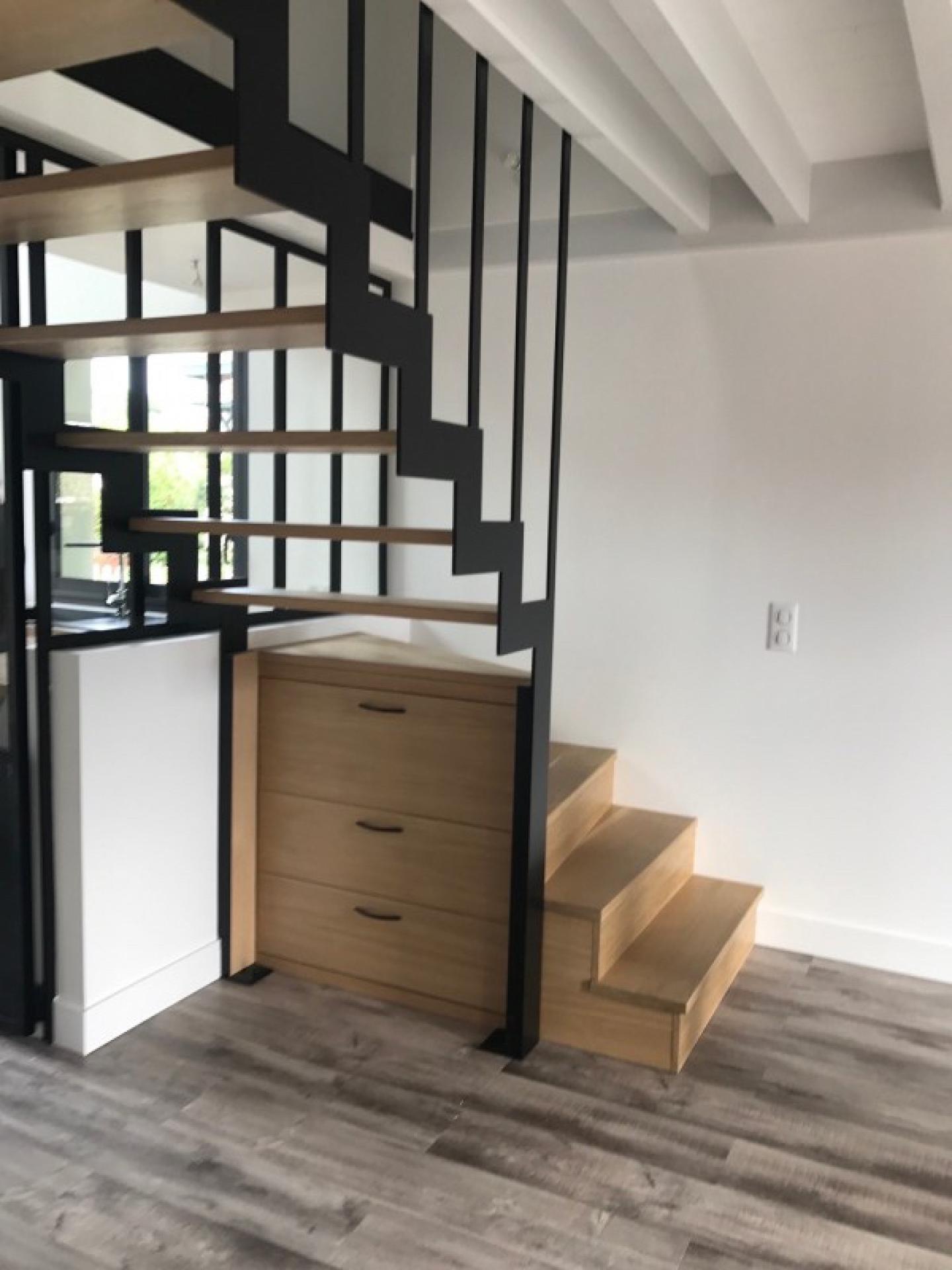 Réalisation d'un escalier en bois et en acier sur-mesure à Bordeaux, ainsi qu'un agencement sous l'escalier à la teste de buch