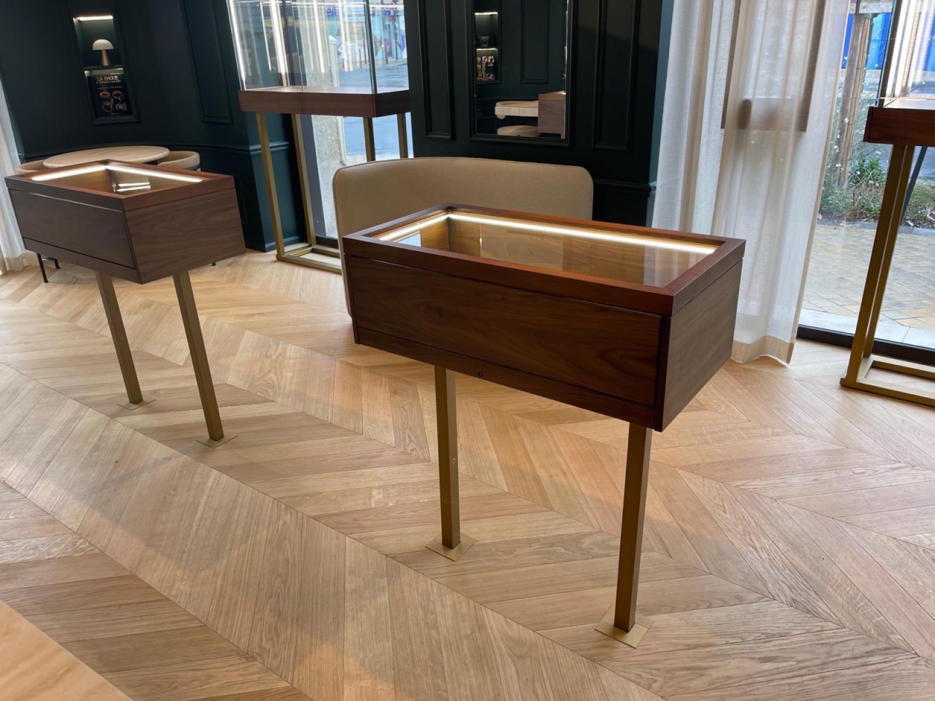 Les matériaux utilisés – acier finition laiton, noyer massif et vitrage clair – ont été choisis avec soin pour offrir élégance et durabilité. Des éclairages LED intégrés mettent en valeur chaque détail et subliment les créations exposées.